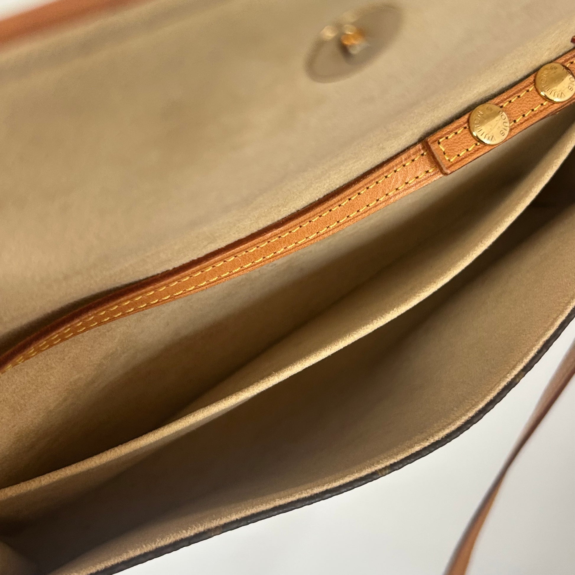 En superbe état d’occasion. (8.5/10) Signes d’usure mineure. Interieur en velours. Bandoulière en excellente condition, détachable. Boutons de la bandoulière et clip magnétique du sac fonctionnent parfaitement.